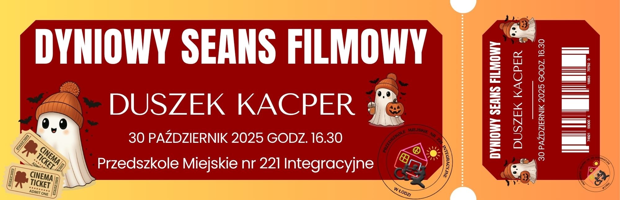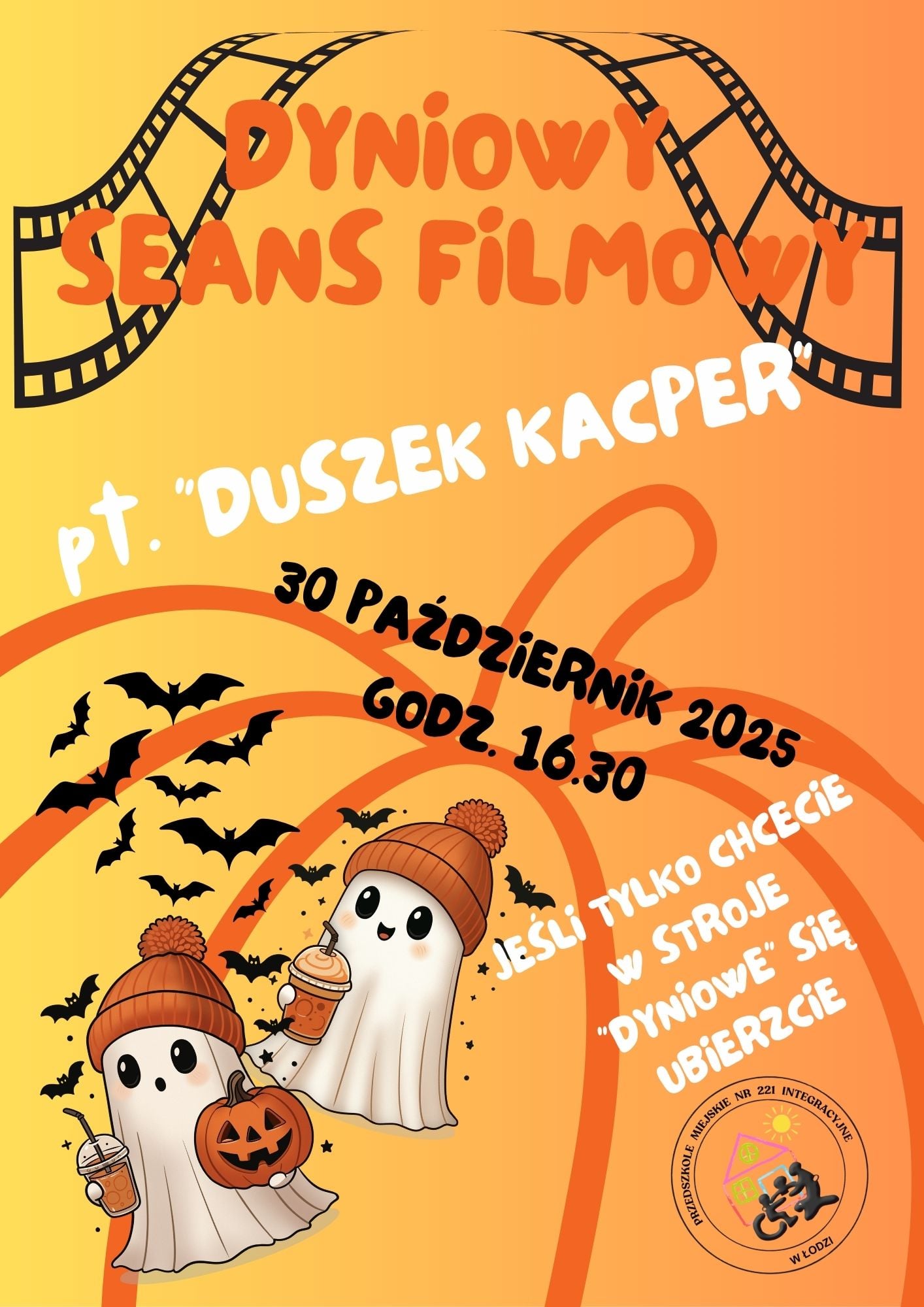 Drodzy Rodzice, serdecznie zapraszamy Wszystkich chętnych na wspólne spotkanie kinowe pt. "Dyniowy seans filmowy", które odbędzie w dniu 30.10.2025 r. o godz. 16:30 w Naszym Przedszkolu. Obejrzymy film pt. "Duszek Kacperek", smakując popcorn i popijając pyszną lemoniadę. Wyrażamy przekonanie, iż będzie to kolejny niezapomniany, spędzony w najlepszym towarzystwie, czas.
