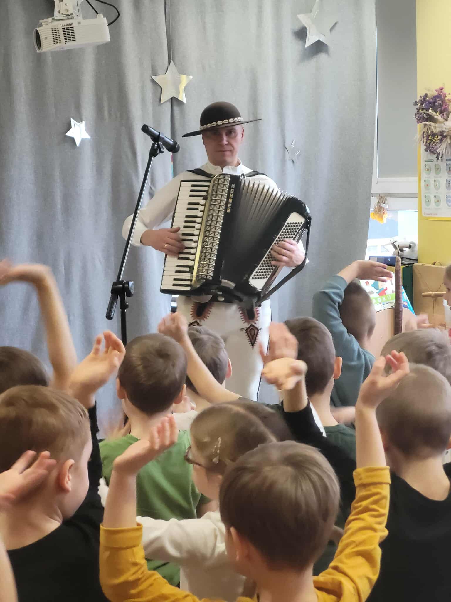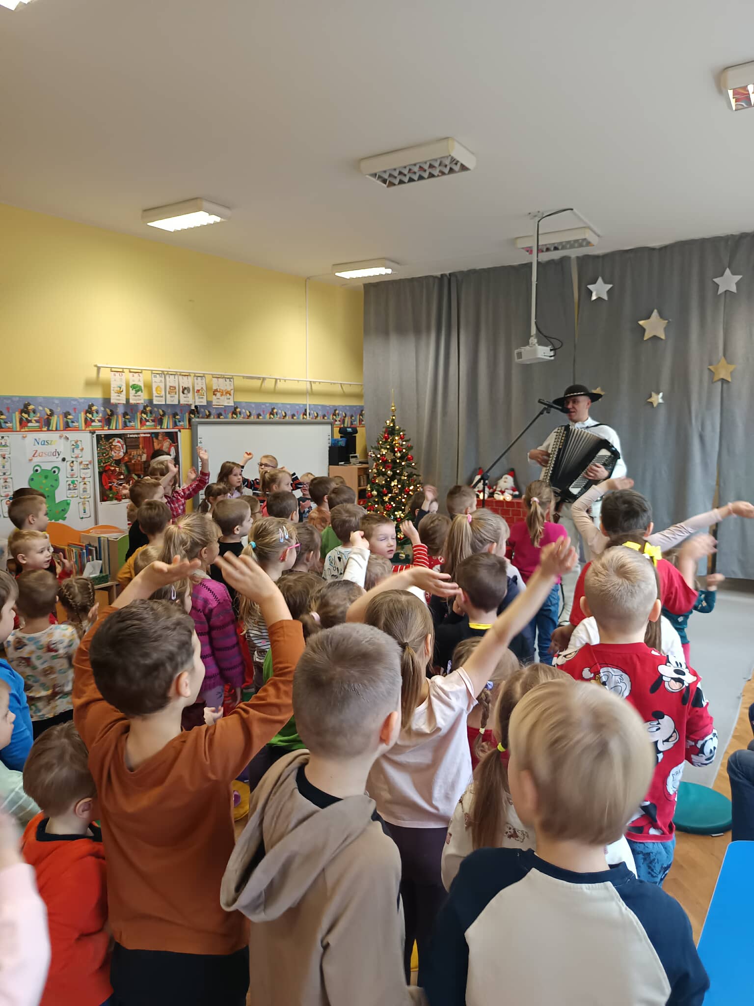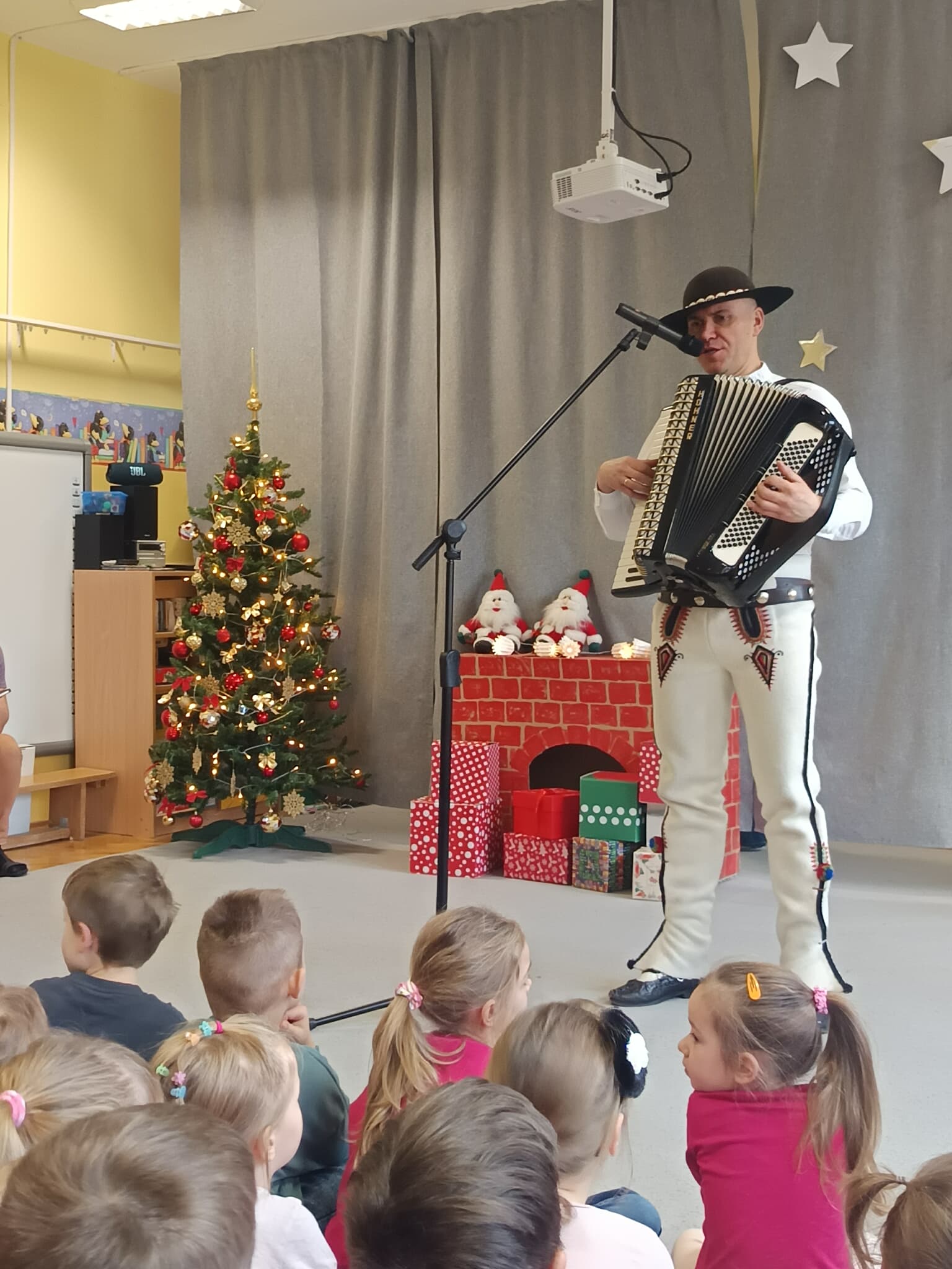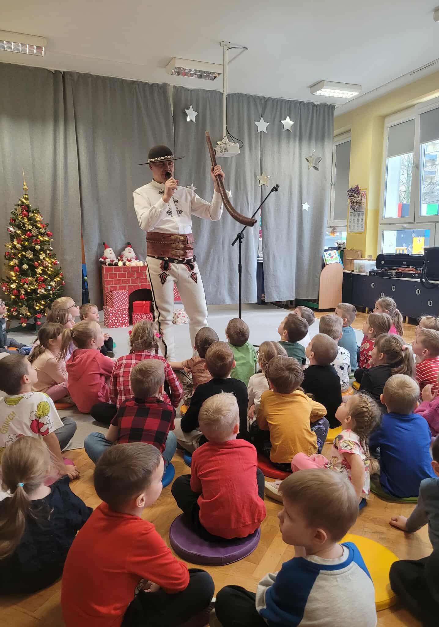 dziś uczestniczyliśmy w niezwykłym spotkaniu z góralem Szczepanem z kapeli góralskiej Góralska Hora, grającym na wielu instrumentach polskie kolędy.