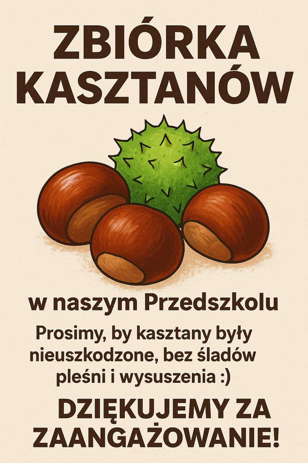 zachęcamy do przyłączenia się do akcji zbiórki kasztanów w Naszym Przedszkolu. Akcja rozpoczyna się w dniu dzisiejszym i trwa do odwołania. Prosimy by kasztany były nieuszkodzone, bez śladów pleśni i wysuszenia. Dziękujemy za Państwa uczestnictwo i zaangażowanie.